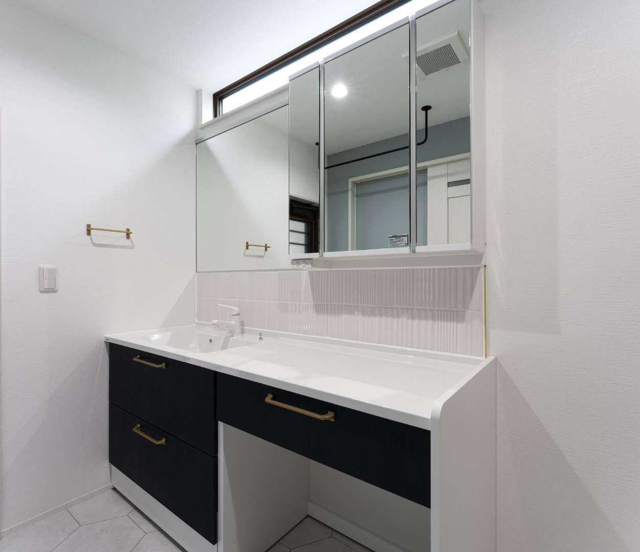 受賞したのは、洗面化粧台と天井の高さの差を活かしてハイサイドライトを設けた、自然光がたっぷり注ぐ洗面空間です。朝の身支度の時間を心地よく過ごしていただけるよう、光の取り入れ方を工夫して設計しました。