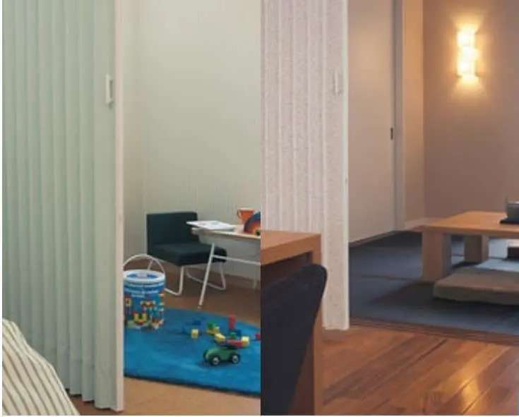 複数の細長いドアを繋ぎ合わせ、折り畳めるようにした間仕切りです。アコーディオンカーテンと似た性質を持ちますが、デザイン性の高いものが多く、インテリアとしても使えます。特徴は、目的に合わせたデザインやスタイルを選べること。壁のように見えるデザイン、中の様子が分かるようなデザイン、光が漏れないようなデザインなど様々な種類があります。