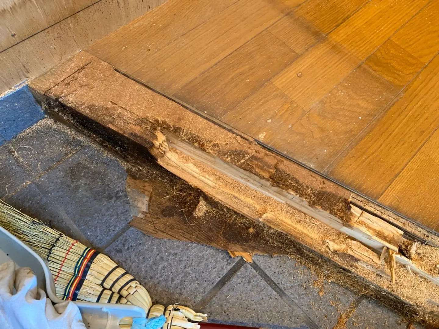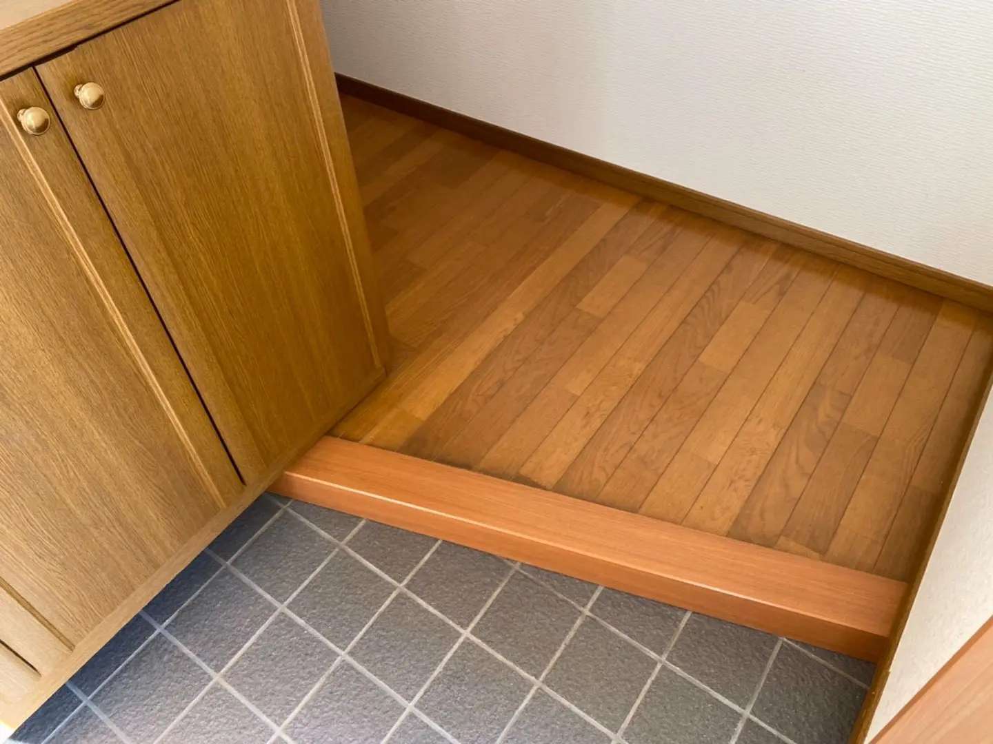 今回は半地下の木造戸建ての玄関框が湿気のため剥がれてきているので交換したいとのご依頼。